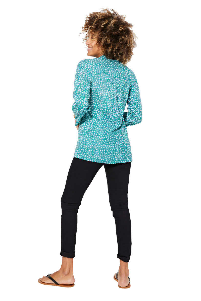 Chemisier long.Coupe droite.Manches 3/4.Col mao.Boutons.Couleur vert, blanc.100% viscose.La correspondance des tailles est la suivante :S/M = 36/38L/XL = 40/42
