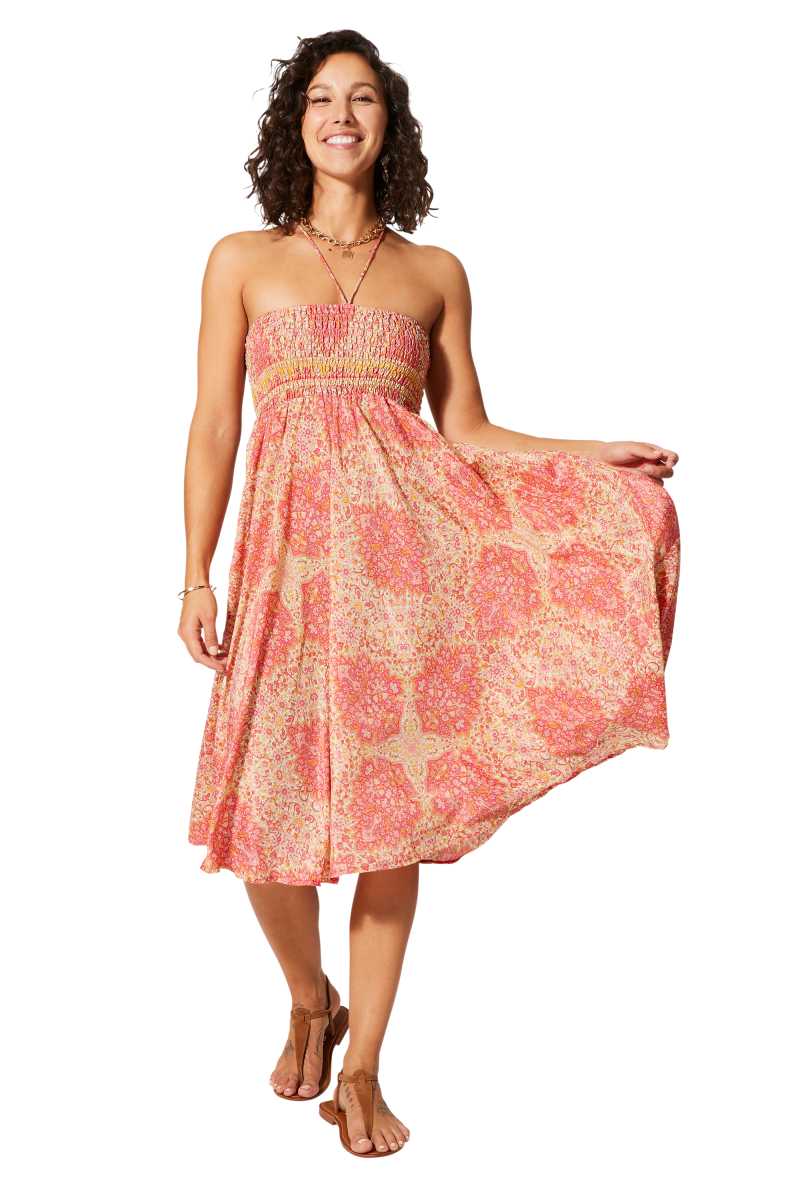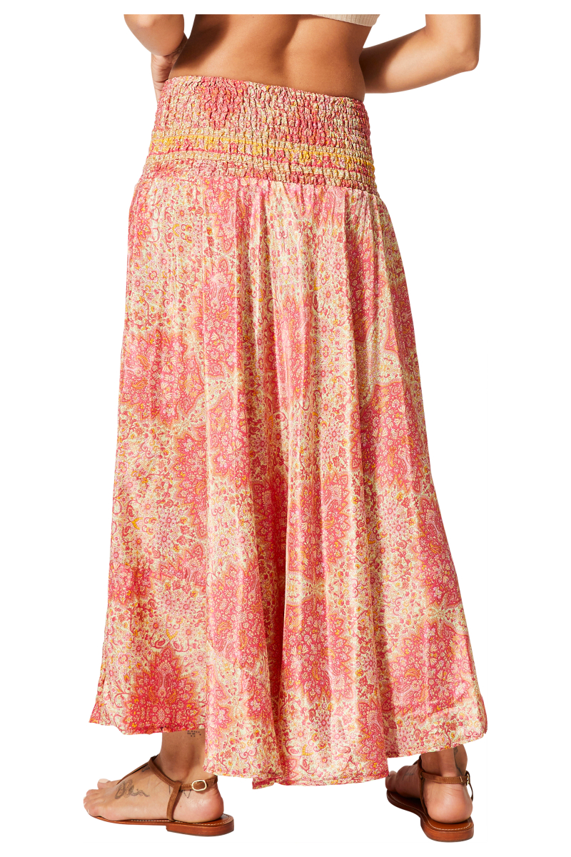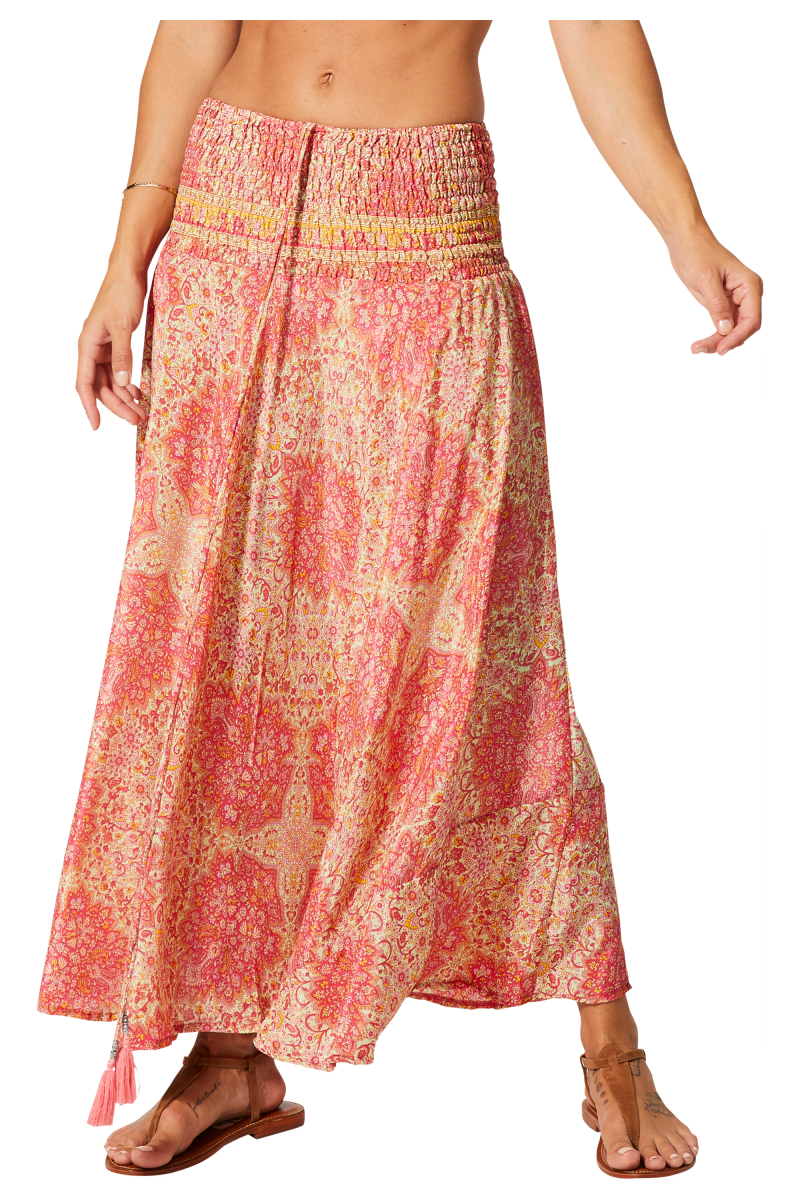 Jupe.Matière : 100% POLYESTER.Construction : tissé.Lavage : machine à laver 30°C.Couleur(s) : rose - creme - jaune.Coupe : plissée.Longueur : longue.Fermeture : taille smockée et liens à nouer.Correspondance taille FR : UNIQUE (36/42).