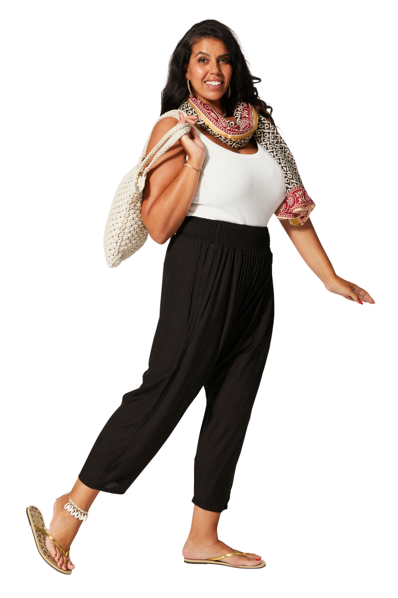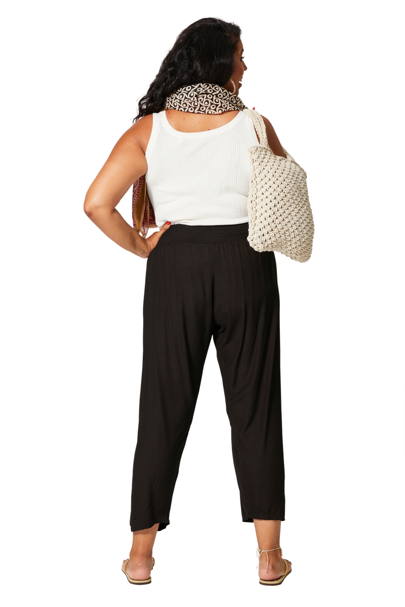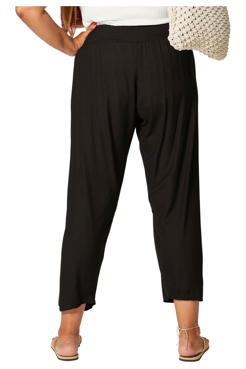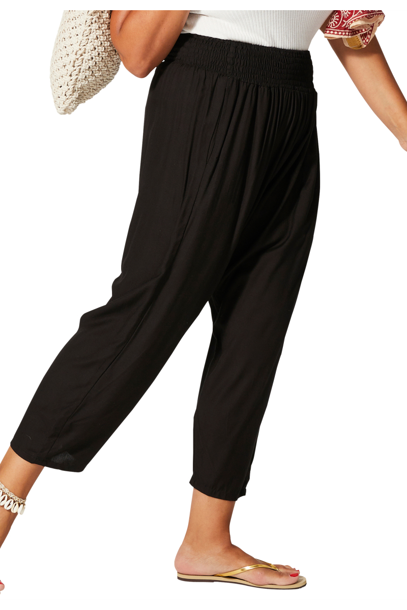 Pantalon.Matière : 100% RAYONNE.Construction : tissé.Lavage : machine à laver 30°C.Couleur(s) : noir.Coupe : droite.Poches : 2 poches devant.Fermeture : taille smockée.Correspondance taille FR : UNIQUE (44/60).