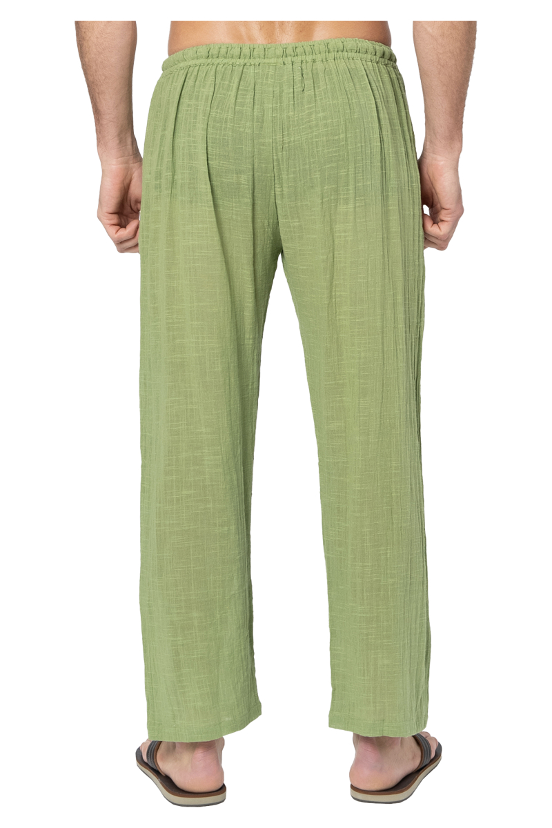 Pantalon.Matière : 100% COTON.Construction : tissé.Lavage : machine à laver 30°C.Couleur(s) : vert.Coupe : droite.Longueur : long.Poches : 2 poches.Fermeture : taille élastique et liens de serrage.Correspondance taille FR : S/M - L/XL (36/38 - 40/42).