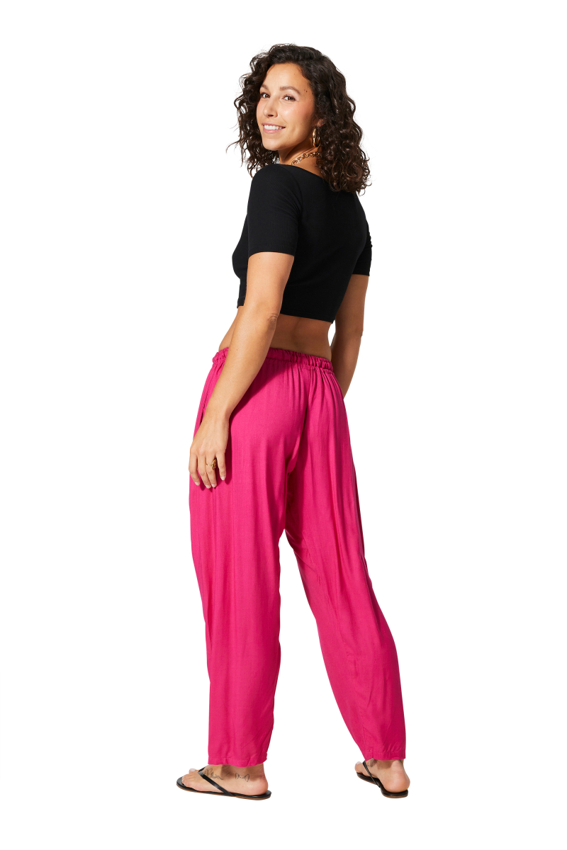 Pantalon.Matière : 100% RAYONNE.Construction : tissé.Lavage : machine à laver 30°C.Couleur(s) : rose.Coupe : droite.Longueur : long.Poches : 2 poches devant.Fermeture : taille élastique avec lien de serrage.Correspondance taille FR : UNIQUE (36/42).