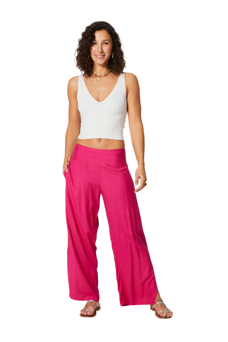 Pantalon.Matière : 100% RAYONNE.Construction : tissé.Lavage : machine à laver 30°C.Couleur(s) : rose.Coupe : droite fendue.Longueur : long.Ourlet : fendu.Poches : 2 poches devant.Fermeture : taille élastique au dos.Correspondance taille FR : S/M - L/XL (36/38 - 40/42).