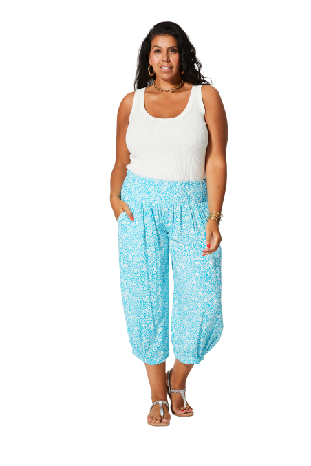 Pantalon.Matière : 100% VISCOSE.Construction : tissé.Lavage : machine à laver 30°C.Couleur(s) : turquoise - blanc.Coupe : large.Longueur : mi-long.Ceinture : integrée.Poches : 2 poches devant.Fermeture : taille smockée.Correspondance taille FR : XL - 1X - 2X - 3X (44/46 - 48/50 - 52/54 - 56/60).