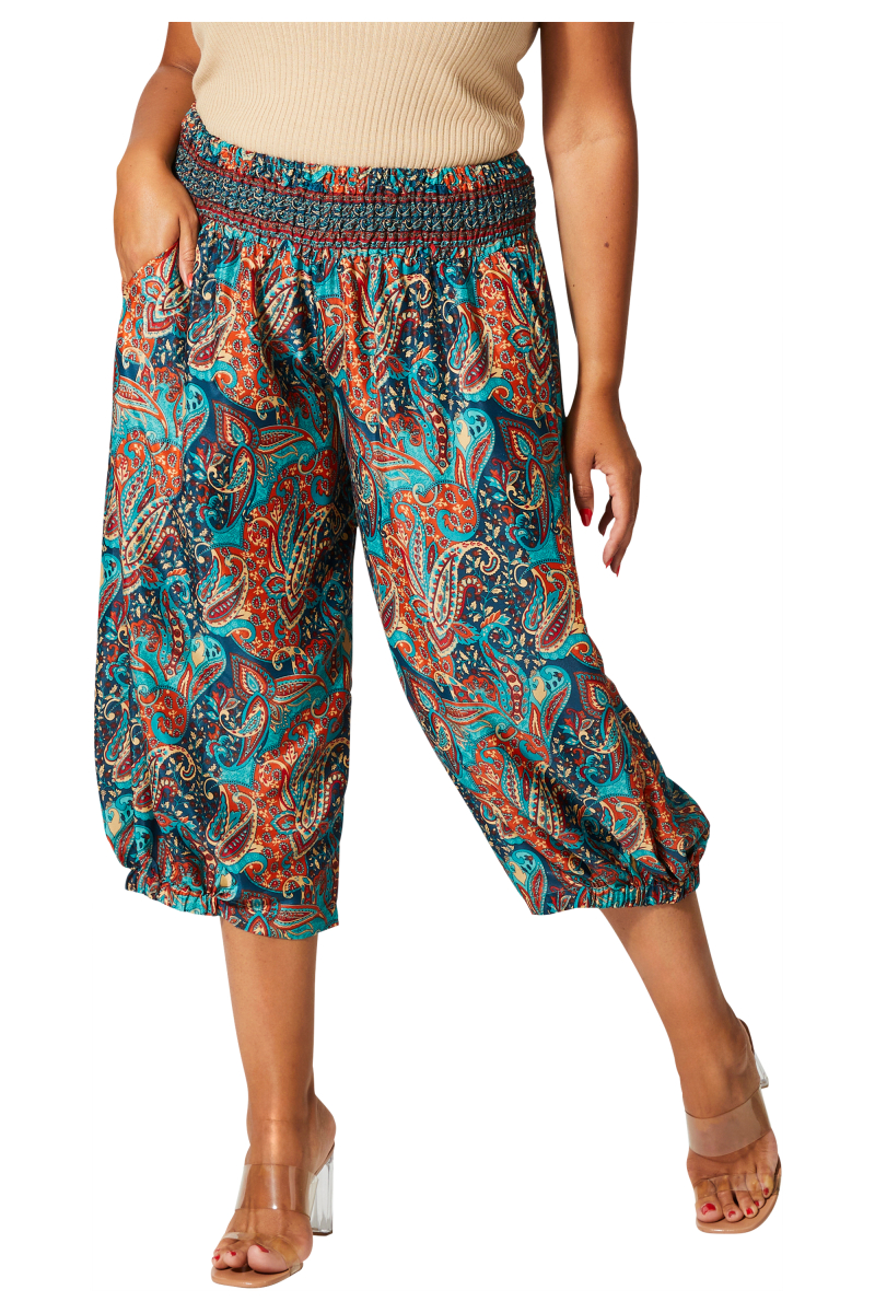 Pantalon.Matière : 100% POLYESTER.Construction : tissé.Lavage : machine à laver 30°C.Couleur(s) : bleu marine - turquoise - orange - bordeaux - creme.Coupe : large.Longueur : mi-long.Ceinture : integrée.Poches : 2 poches devant.Fermeture : taille smockée.Correspondance taille FR : XL - 1X - 2X - 3X (44/46 - 48/50 - 52/54 - 56/60).