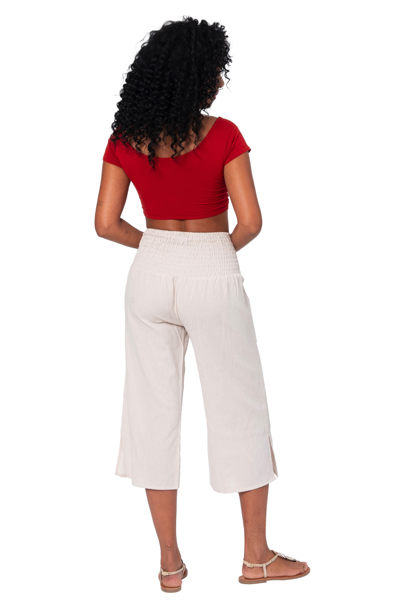 Pantalon.Matière : 70% COTON - 30% LIN.Construction : tissé.Lavage : machine à laver 30°C.Couleur(s) : beige.Coupe : évasée.Longueur : mi-long.Poches : 2 poches.Fermeture : dos smocké.Correspondance taille FR : S/M - L/XL - XXL (36/38 - 40/42 - 44).