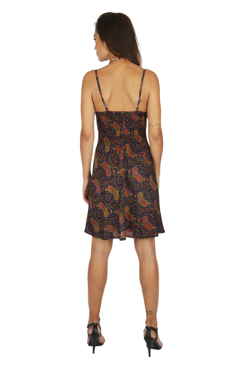 La robe caraco façon nuisette d'été fluide pour femme Adèlia ou appelé encore slip dress très tendance pour la saison estivale est une tenue pour femme ultra féminine qui se caractérise par de fines bretelles réglables, d'une coupe moulante et d'un style robe nuisette. Sa matière polyester est fluide et légère et la rend confortable. Son décolleté est en V et son dos possède un large bandeau élastique pour ne pas oppresser la poitrine. Sa coupe courte est près du corps et son originalité se fait par ses imprimés et couleurs bohème.Si vous assumez vos formes efféminées nous vous conseillons d'acheter ce produit car vous serez à votre aise pour un été chaud. Privilégiez-la pour les sorties à la mer, les promenades aux marchés ou bien simplement en tenue de journée. Par contre, évitez de porter cette robe caraco si vous êtes invité à un mariage. Cet habit peut être accessoirisé simplement d'un collier fin et de chaussures soit plate ou à talons.Cette robe caraco façon nuisette d'été fluide pour femme Adèlia a plusieurs particularité : C'est un vêtement tendance femme courte.La coupe de cette slip dress est moulante.Son décolleté en V.Elle a des imprimés fleuris motifs bohème.Ses fines bretelles se règlent.Le dos possède un large bandeau élastique.La matière de cette robe fluide est 100% polyester.Cette robe nuisette est artisanale et a été produit en Inde. Ce vêtement est à laver en machine à 30°C maximum. Nous vous conseillons pour les premiers lavages de la laver séparément des autres vêtements afin d'éviter un dégorgement ou une décoloration étant donné qu'il est neuf. Sur la photo, la mannequin porte la robe caraco en taille S/M soit du 36/38. Sa correspondance de taille se fait donc : S/M = 36/38 L/XL = 40/42Cette robe nuisette tendance et féminine se distingue en d'autres variantes pour l'été et toujours pas cher.