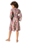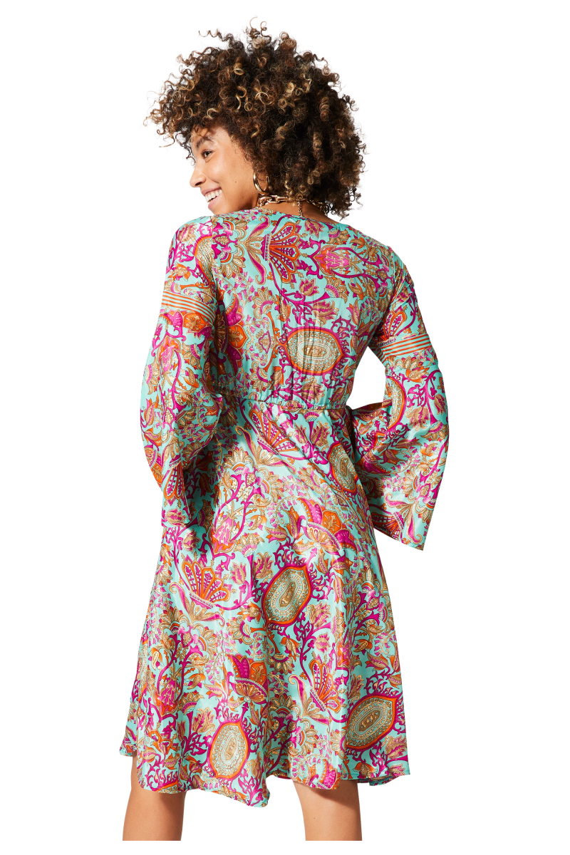 Robe.Matière : 100% POLYESTER.Construction : tissé.Lavage : machine à laver 30°C.Couleur(s) : or - turquoise - rose - orange - beige.Coupe : cintrée.Longueur : courte.Manches : manches 3/4, évasées.Col : v.Fermeture : liens de serrage.Correspondance taille FR : S/M - L/XL (36/38 - 40/42).