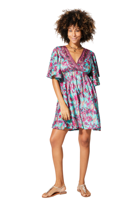Robe.Matière : 100% POLYESTER.Construction : tissé.Lavage : machine à laver 30°C.Couleur(s) : turquoise - rose - creme.Coupe : évasée.Longueur : courte.Manches : manches courtes, évasées.Col : décolleté et dos en v, cache-coeur.Fermeture : taille élastique et liens à nouer.Correspondance taille FR : S/M - L/XL (36/38 - 40/42).