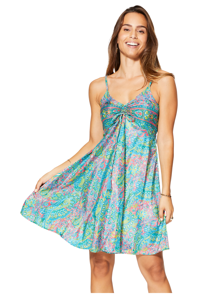Robe.Matière : 100% POLYESTER.Construction : tissé.Lavage : machine à laver 30°C.Couleur(s) : vert - turquoise - rose - blanc.Coupe : évasée.Longueur : courte.Manches : sans manches, bretelles fines à nouer.Col : v, liens de serrage.Fermeture : dos smocké.Correspondance taille FR : S/M - L/XL (36/38 - 40/42).