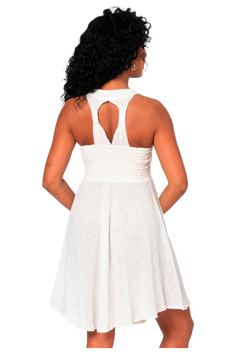 Robe.Matière : 100% COTON.Construction : tissé.Lavage : machine à laver 30°C.Couleur(s) : blanc.Coupe : évasée.Longueur : courte.Manches : sans manches, bretelles larges.Col : v, dos nageur diamant.Fermeture : dos smocké.Correspondance taille FR : S/M - L/XL (36/38 - 40/42).