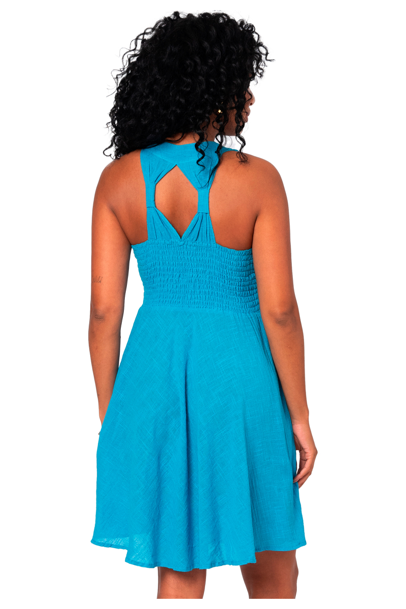 Robe.Matière : 100% COTON.Construction : tissé.Lavage : machine à laver 30°C.Couleur(s) : bleu.Coupe : évasée.Longueur : courte.Manches : sans manches, bretelles larges.Col : v, dos nageur diamant.Fermeture : dos smocké.Correspondance taille FR : S/M - L/XL (36/38 - 40/42).