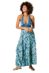 Robe.Matière : 100% POLYESTER.Construction : tissé.Lavage : machine à laver 30°C.Couleur(s) : bleu - turquoise.Coupe : évasée à volants.Longueur : longue.Manches : sans manches, dos nu à nouer.Col : décolleté v.Fermeture : dos smocké.Correspondance taille FR : UNIQUE (36/42).