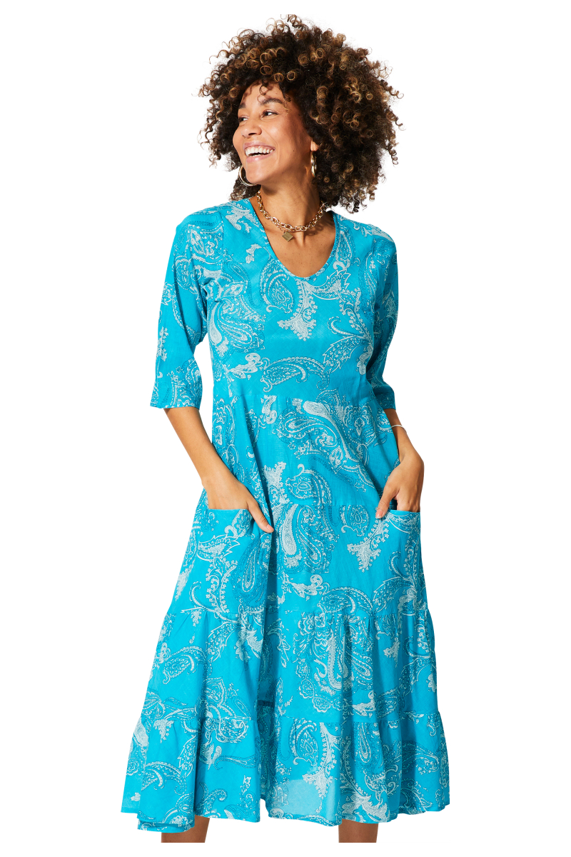 Robe.Matière : 100% VOILE DE COTON.Construction : tissé.Lavage : machine à laver 30°C.Couleur(s) : turquoise - blanc.Coupe : évasée à volants.Longueur : mi-longue.Manches : manches 3/4.Col : rond.Poches : 2 poches devant.Correspondance taille FR : S/M - L/XL - XXL (36/38 - 40/42 - 44).
