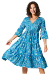 Robe.Matière : 100% POLYESTER.Construction : tissé.Lavage : machine à laver 30°C.Couleur(s) : bleu - turquoise.Coupe : évasée à volants.Longueur : mi-longue.Manches : manches 3/4, à volants.Col : v.Fermeture : liens de serrage.Correspondance taille FR : S/M - L/XL (36/38 - 40/42).