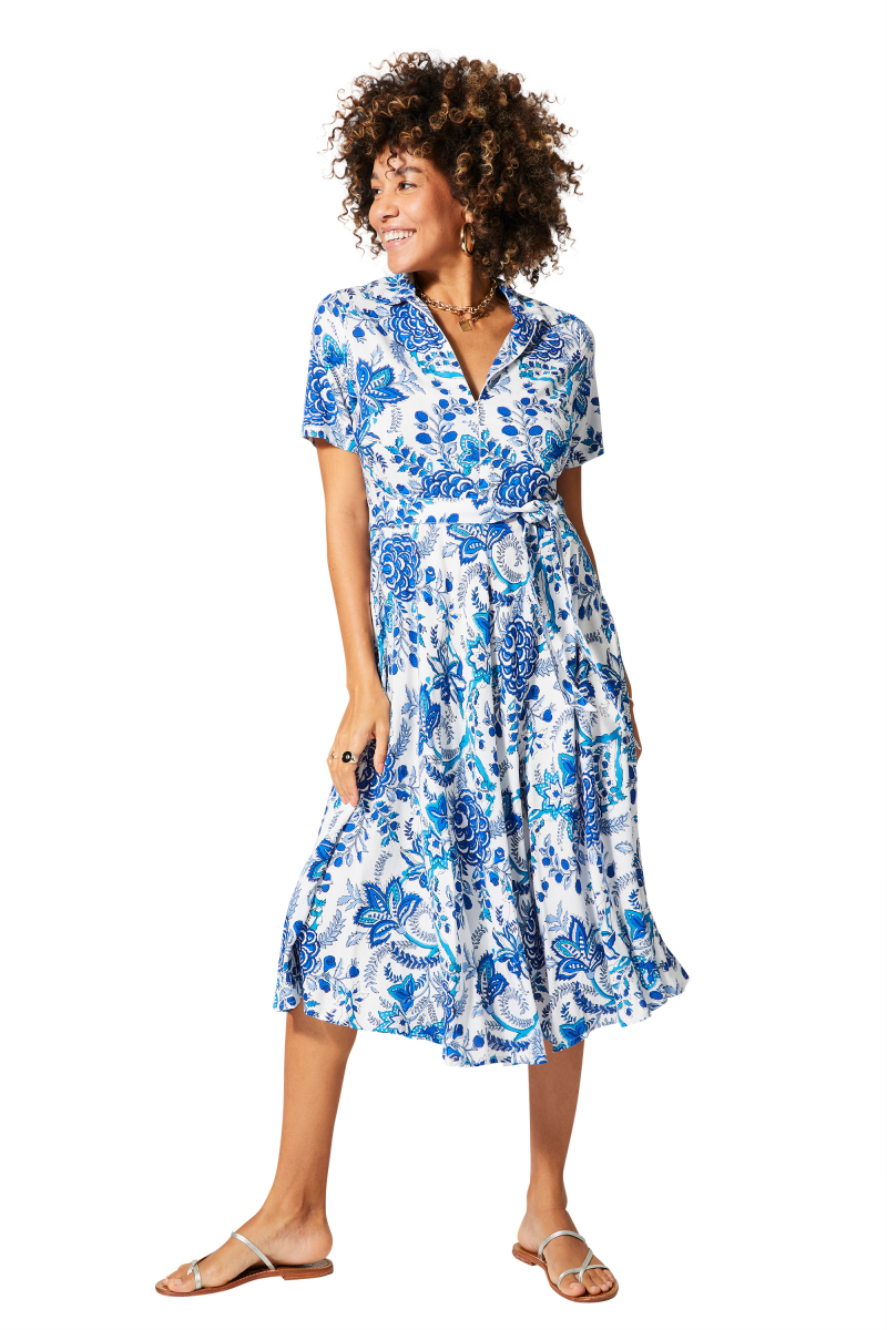 Robe.Matière : 100% VISCOSE.Construction : tissé.Lavage : machine à laver 30°C.Couleur(s) : blanc - bleu - gris - turquoise.Coupe : cintrée.Longueur : mi-longue.Manches : manches courtes.Col : chemise, fermeture eclair.Ceinture : amovible.Correspondance taille FR : S/M - L/XL - XXL (36/38 - 40/42 - 44).