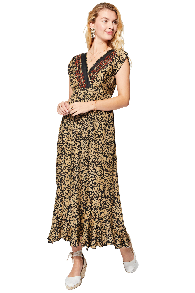 La robe femme mi-longue élégante à imprimé ethnique Jana crée une allure charmante. Sa matière en polyester, douce et fluide souligne les formes à la perfection. Des petites manches mettent en valeur son décolleté en V version cache c?ur. Au dos se trouve un élastique pour cintrer la taille et produit un effet plissé. De coupe évasée, on retrouve en bas un tissu avec des mouvements ondulés pour confirmer sa tendance gypsie. Son imprimé aux couleurs pétillantes provoque du caractère et un style que l'on adore.Cette robe longue de style bohème peut être porté en tenue chic comme elle dégage une allure élégante, complétez-la alors de bijoux fantaisies. Pour un look plus tranquille, vous avez option de la mettre avec une veste en jean. Cette robe longue est à porter sans modération pour tout type d'évènement occasionnel ou journalier.Lavez-ce vêtement femme en machine à 30°C maximum! Inutile de le baigner dans un contenant ce qui risquerait de le décolorer. Nous vous préconisons pour les premiers lavages de le nettoyer séparément des autres linges ou de le laver avec des articles de couleurs noirs afin d'éviter dégorgement et décoloration comme c'est un produit neuf. Le mannequin sur les photos mesurant 1m75 porte cette robe longue été en taille 36/38 soit du S/M. La longueur totale de cette création est d'environ 127cm. Pour la correspondance de tailles de ce vêtement, les infos sont :S/M = 36/38L/XL = 40/42La robe femme mi-longue élégante à imprimé ethnique Jana est une tenue féminine et originale. Elle se compose de plusieurs qualités.C'est une robe mi longue originale.Son décolleté est en cache c?""ur.Elle a de petites manches courtes.Cette robe dispose d'un élastique au dos.Le bas de la robe est ondulé par son surfil.Elle a un imprimé ethnique.C'est une robe ample de coupe évasée.Sa matière fluide est 100% polyester.Ce vêtement femme d'été est de fabrication artisanale indienne.Cette robe longue pas cher a été conçue en différents coloris et imprimés et toujours de même style.""
