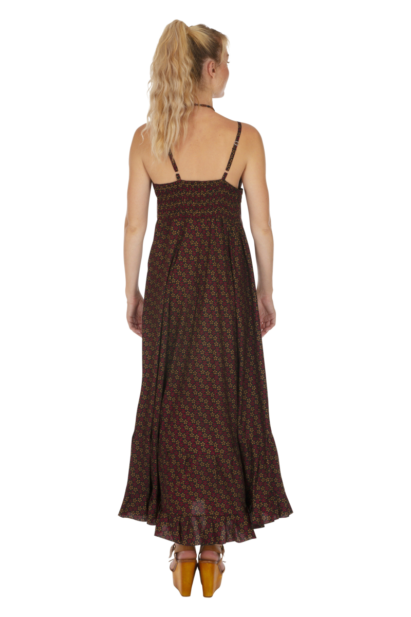 La robe longue à fleurs et à volant pour femme Luciana est un bon compromis lorsque nous voulons changer d'un pantalon. C'est un vêtement intéressant à porter comme nous le précisons.C'est une robe longue originale.Son décolleté est en V avec des liens à pompons pour froncer.Ses bretelles sont fines et réglables.Cette robe chic dispose d'un large élastique au dos.Le bas se distingue en plusieurs panneaux de tissus.Elle est imprimé à fleurs.C'est une robe fluide et ample de coupe évasée.Sa matière est 100% polyester.Sa longueur est d'environ 137cm.Ce vêtement femme d'été est de fabrication artisanale indienne. Lavez-ce vêtement femme en machine à 30°C maximum! Inutile de le baigner dans un contenant ce qui risquerait de le décolorer. Nous vous préconisons pour les premiers lavages de le nettoyer séparément des autres linges ou de le laver avec des articles de couleurs noirs afin d'éviter dégorgement et décoloration comme c'est un produit neuf. Le mannequin sur les photos porte cette robe longue été en taille 36/38 soit du S/M. Voici donc la correspondance de tailles pour ce vêtement pas cher :S/M = 36/38L/XL = 40/42 La robe longue à fleurs et à volant pour femme Luciana nous rappelle que même en robe nous pouvons être décontractées. Cette tenue estivale et de coupe évasée qui est composée de larges bandes de tissus assemblées entre elles faisant une robe à volants, au niveau du bas. Entres elles se forment des plis au-devant et au derrière pour assurer un style bohème. Son décolleté est discret et peut être modifié et accentué par des liens ornés de pompons en les fronçant au milieu. Ses bretelles fines sont réglables et son dos possède un large bandeau élastique pour une bonne tenue. Sa matière en polyester apporte un tombé fluide et léger. Son coloris original est relevé par des motifs fleuris. Cet habit au style gypsie est une occasion de parfaite pour porter un robe originale et confortable. Elle peut être mise à votre quotidien avec des sandales plates et quelques bijoux. Cette robe longue d'été a été conçue en différentes couleurs et imprimés afin d'être sûr que votre couleur fétiche soit disponible.