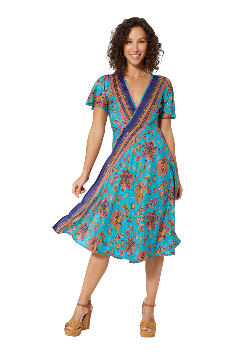 Robe mi-longue.Coupe portefeuille.Manches courtes.Col décolleté v.Couleur bleu, rose, marron.100% polyester.La correspondance des tailles est la suivante :S/M = 36/38L/XL = 40/42XXL = 44
