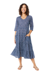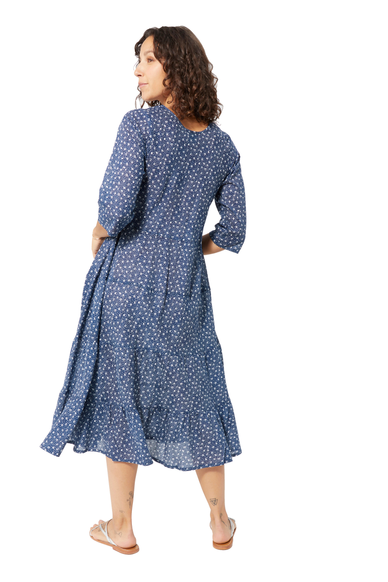 Robe mi-longue.Coupe évasée à volants.Manches 3/4.Col rond.2 poches devant.Couleur bleu, blanc.100% voile de coton.La correspondance des tailles est la suivante :S/M = 36/38L/XL = 40/42XXL = 44