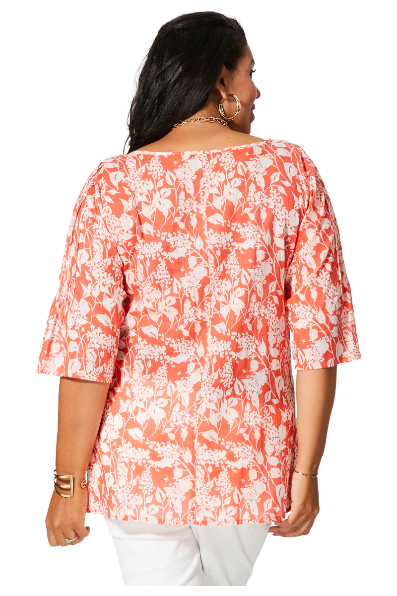Tunique.Matière : 100% VOILE DE COTON.Construction : tissé.Lavage : machine à laver 30°C.Couleur(s) : orange - blanc.Coupe : plissée.Longueur : courte.Manches : manches 3/4.Col : rond.Correspondance taille FR : XL - 1X - 2X - 3X (44/46 - 48/50 - 52/54 - 56/60).